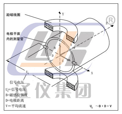 電磁流量計(jì)所依據(jù)的基本原理是法拉第電磁感應(yīng)定律,導(dǎo)體在磁場(chǎng)中做切割磁力線運(yùn)動(dòng)時(shí),導(dǎo)體內(nèi)將產(chǎn)生感應(yīng)電動(dòng)勢(shì)。將該原理應(yīng)用于測(cè)量管內(nèi)流動(dòng)的導(dǎo)電液體,并且流體流動(dòng)的方向與磁場(chǎng)方向垂直(見(jiàn)圖)。流體中產(chǎn)生的感應(yīng)電動(dòng)勢(shì)被位于管子徑向兩端的一對(duì)電極檢測(cè)到,該感應(yīng)電動(dòng)勢(shì)被位于管子徑向兩端的一對(duì)電極檢測(cè)到,該感應(yīng)電動(dòng)勢(shì)(信號(hào)電壓)UE與磁感應(yīng)強(qiáng)度B,電極間距離D和平均流速V成正比。因磁感強(qiáng)度B和電極距離D和平均流速V成正比。因磁感應(yīng)強(qiáng)度B和電極距離D是常數(shù),所以感應(yīng)電動(dòng)勢(shì)(信號(hào)電壓)UE與平均流速V成正比,而體積流量又與平均流速V成正比,所以體積流量與感應(yīng)信號(hào)電壓成正比。在信號(hào)轉(zhuǎn)換器中,該感應(yīng)信號(hào)電壓被轉(zhuǎn)換成體積流量,同時(shí)轉(zhuǎn)換成可編程的模擬和數(shù)字信號(hào)輸出。